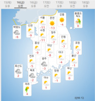 금요일인 16일은 전국이 가끔 구름이 많겠다.제주도는 새벽까지 비 또는 눈이 내리겠다. 예상 적설량은 1㎝ 내외, 강수량은 5㎜ 안팎이다.미세먼지 농도는 원활한 대기 확산으로 전 권역이 '좋음' 수준을 보이겠다.바다의 물결은 동해 앞바다에서 0.5∼2.0m, 서해·남해