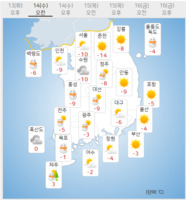 수요일인 14일은 수도권 북부와 강원도, 경상권은 대체로 맑겠고 그 밖의 지역은 구름이 많겠다.새벽부터 오전 사이 경기 남부 서해안과 충청권, 전라권, 경남 서부 내륙에는 비 또는 눈이 내리겠다. 제주도에도 오후까지 가끔 비 또는 눈이 오는 곳이 있겠다.충남 서해안과