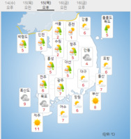 목요일인 15일은 전국이 대체로 흐리겠다.오전부터 저녁 사이 동해안을 제외한 중부지방과 전북, 경북 북부에 비 또는 눈이 내리겠다.예상 강수량은 5㎜ 내외다.예상 적설량은 경기 내륙·강원 중남부 내륙 산지·충북 북부는 2∼5㎝, 서울·인천·경기 서해안·강원 북부 내륙·