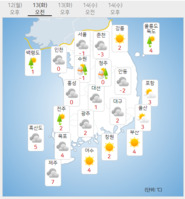 화요일인 13일은 많은 지역에 눈이 내리겠다.예상 적설량은 경기 남부, 강원 남부 내륙·산지, 충청권, 전북 동부 2∼7㎝, 수도권, 강원 중·북부 내륙·산지, 전북 서부, 경북 북부 내륙, 경북 남서 내륙, 서해5도 1∼3㎝다. 경남 북서 내륙에도 1㎝ 미만의 눈이
