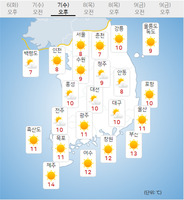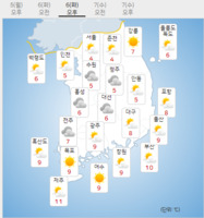 화요일인 6일은 전국에 가끔 구름이 많겠다.경기 남부와 충남권, 충북 중·북부, 전북 북부는 새벽부터 낮 사이, 늦은 밤부터 모레 아침 사이에 비 또는 눈이 내리겠다.예상 적설량은 경기 남부, 충남 서해안 1∼3cm, 충남권, 충북 중·북부, 전북 북부는 1cm 내외이