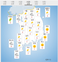 금요일인 2일에도 전국적으로 강추위가 이어지겠다.아침 최저기온은 -13∼1도, 낮 최고기온은 0∼9도로 예보됐다.충남 서해안과 전라 서해안은 새벽에 눈이 오는 곳이 있겠고, 제주도는 아침까지 가끔 비나 눈이 내리겠다.예상 적설량은 제주도 산지 1∼5㎝, 충남 서해안,