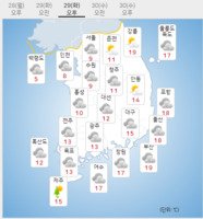 화요일인 29일은 전국이 대체로 흐리고 아침까지 전국에 돌풍과 천둥·번개를 동반한 비가 오겠다.비가 그친 뒤에는 찬 공기가 남하하면서 기온이 28일보다 4∼10도 가량 크게 낮아지겠다.제주도는 낮까지 비가 오는 곳이 있겠고, 경상권에는 낮까지 빗방울이 떨어지는 곳이 있
