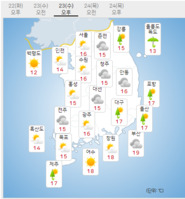 수요일인 23일은 전국이 대체로 흐리겠다.전날부터 내린 비는 오전에 대부분 지역에서 그치겠다.다만 강원 영동과 경북 동해안은 곳에 따라 밤까지 비가 내리겠고 강원 영서와 충북 일부 지역에도 낮에 빗방울이 떨어지겠다.예상 강수량은 강원 영동과 경북 동해안, 경북 북동 산