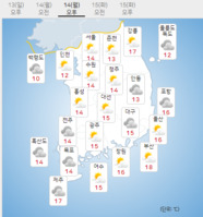 월요일인 14일은 전국에 구름이 많겠다.찬 공기가 내려오면서 기온이 점차 낮아져 춥겠다.새벽부터 아침 사이 강원 영동에는 0.1㎜ 미만의 빗방울이 떨어지는 곳이 있겠다.아침 최저기온은 3∼11도, 낮 최고기온은 12∼18도로 예보됐다.대부분 해상에 풍랑특보가 발효된 가
