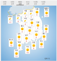 수요일인 9일은 중부지방에 구름이 많고 남부지방과 제주도는 대체로 맑겠다.아침 최저기온은 1∼11도, 낮 최고기온은 15∼21도로 예보됐다.낮과 밤의 기온 차가 전국 대부분 지역에서 10도 안팎으로 벌어지고, 남부 내륙은 15도 이상 매우 큰 곳도 있겠다.바다의 물결은