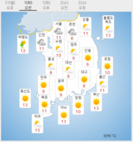 화요일인 11월1일은 중부지방이 대체로 흐리다가 오후부터 차차 맑아지겠다. 남부지방과 제주도는 대체로 맑겠다.이날은 중국 북부지방에서 남동쪽으로 이동하는 고기압의 영향을 차차 받겠으나, 중부지방은 낮까지 북쪽을 지나는 약한 기압골의 영향을 받겠다.따라서 오전부터 낮 사