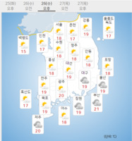 수요일인 26일은 전국이 대체로 맑다가 오후부터 구름이 많아지겠다.중부 내륙과 경북 북부 내륙, 전북 동부를 중심으로 서리가 내리고 얼음이 어는 곳이 있겠으니 농작물 냉해가 없도록 유의해야 한다.동해상과 그 밖의 남해상, 제주도 해상은 바람이 매우 강하게 불고 물결이
