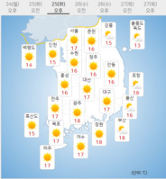 화요일인 25일은 전국 대부분 지역이 맑겠다.강원 영동과 경상권 동해안은 대체로 흐리다가 밤부터 맑아지겠다.경남권 동해안은 전날 늦은 밤부터 이날 새벽까지 빗방울이 떨어지는 곳이 있겠다.해발고도 1천m 이상인 강원 산지를 중심으로 1∼5㎝의 눈이 쌓이는 곳이 있겠다.새