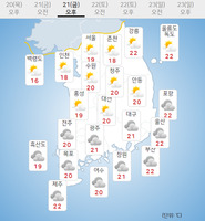 금요일인 21일은 전국적으로 가끔 구름이 많다가 오후부터 차차 흐려지겠다.오후부터 밤사이 강원 산지에는 0.1㎜ 미만의 빗방울이 떨어지는 곳이 있겠다.아침 최저기온은 4∼13℃, 낮 최고기온은 17∼22℃로 예보됐다.미세먼지 농도는 인천·경기 남부·충남은 '나쁨', 그
