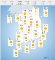 목요일인 20일 전국이 대체로 맑은 가운데 쌀쌀한 날씨가 이어지겠다.아침 최저기온은 0∼11℃, 낮 최고기온은 17∼22℃로 예보됐다.미세먼지 농도는 전 권역이 '좋음'∼'보통' 수준으로 예상된다.다만 인천·경기 남부·충남은 밤에 일시적으로 '나쁨' 수준을 보이겠다.새