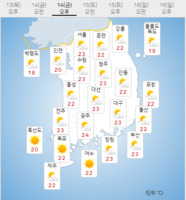 금요일인 14일은 전국에 구름이 많겠다.아침 최저기온은 7∼16도, 낮 최고기온은 20∼25도로 예보됐다.내륙을 중심으로 낮과 밤의 기온 차가 15도 안팎으로 크겠으니 건강 관리에 유의해야겠다.새벽부터 아침까지 내륙을 중심으로 가시거리 1km 미만의 안개가 끼는 곳이