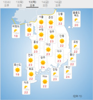 목요일인 13일 전국이 대체로 맑겠다.아침 최저기온은 6∼16도, 낮 최고기온은 20∼24도로 평년 기온을 회복하겠다.아침 사이 내륙을 중심으로 가시거리 1㎞ 미만의 안개가 끼는 곳이 있겠다.새벽부터 아침 사이 강원 높은 산지에 얼음이 얼고, 내륙과 산지에는 서리가 내