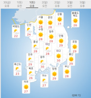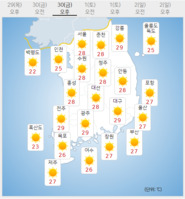 금요일인 30일은 전국이 대체로 맑겠다.아침 최저기온은 11∼19도, 낮 최고기온은 25∼29도로 예보됐다.내륙 대부분 지역에서 낮과 밤의 기온 차가 15도 이상으로 매우 크겠으니 건강관리에 유의해야 한다.미세먼지 농도는 대기 정체의 영향으로 인천·경기 남부·충남 등