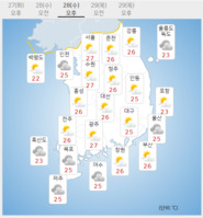 수요일인 28일은 전국에 가끔 구름이 많겠다.동풍의 영향으로 경북 남부 동해안과 경남권 동해안에 오후 가끔 빗방울이 떨어지는 곳이 있겠다.당분간 아침 기온은 경기 동부와 강원내륙, 경북 북동 산지를 중심으로 10도 내외로 쌀쌀하겠다.특히 낮과 밤의 기온 차가 경기 동부
