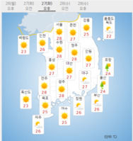 화요일인 27일 중부지방은 대체로 맑고 남부지방과 제주도는 가끔 구름이 많겠다.당분간 경기 동부와 강원 내륙, 경북 북부 내륙을 중심으로 아침 기온이 10도 안팎으로 떨어져 쌀쌀하겠으니 건강 관리에 유의해야 한다.제주도 남쪽 먼바다에는 바람이 강하게 불고 물결도 높게