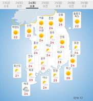 토요일인 24일은 전국이 대체로 맑겠으나 남해안과 제주도에는 가끔 구름이 많겠다.아침 최저기온은 11∼19℃, 낮 최고기온은 22∼26℃로 예보됐다.당분간 내륙을 중심으로 최고-최저기온 차가 10℃ 이상 크겠으니 환절기 건강 관리에 유의해야 한다.미세먼지 농도는 대기