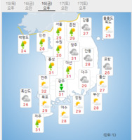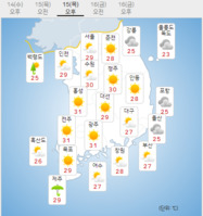 목요일인 15일은 중부지방에 가끔 구름이 많겠고 강원 영동과 남부지방, 제주도는 대체로 흐리겠다.제주도 지역은 16일까지 10∼40㎜의 비가 내릴 것으로 예보됐다.아침 최저기온은 17∼23도, 낮 최고기온은 23∼31도로 예보됐다.내륙을 중심으로 낮과 밤의 기온 차가