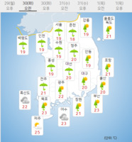 화요일인 30일은 전국이 흐리고 비가 오겠다.서해상에서 동쪽으로 이동하는 저기압의 영향으로 새벽∼아침에 전국 대부분 지역에서 비가 시작되겠다.예상 강수량은 중부지방, 전북 북부, 경북 북부, 서해5도, 울릉도·독도 30∼80㎜이다. 전북 남부, 전남권, 경북권 남부,