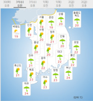 수요일인 31일에도 전국이 흐리고 비가 오겠다.수도권에는 새벽 3∼6시께까지, 충남권과 전라권에는 오전 6∼9시께까지 비가 내리겠다. 강원 영서와 충북은 오전 6시∼낮 12시, 강원 영동·경상권은 낮 12시∼오후 6시까지 비 예보가 있다.경북 남부 동해안과 경남권 일부