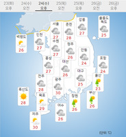 수요일인 24일은 중·남부지역을 중심으로 비가 내릴 것으로 예상된다.예상 강수량은 충남권·전북·경북 서부 10∼50㎜, 충북·전남권·경상권(경북 서부 제외)·제주도 5∼30㎜다.아침 최저기온은 18∼25℃, 낮 최고기온은 23∼30℃로 예보됐다.서울은 아침 최저기온 2