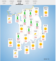 금요일인 29일은 전국에 무더위가 이어지는 가운데 내륙 곳곳에 소나기가 내리겠다.수도권과 강원 내륙·산지, 충청권 내륙, 전북 북부 내륙, 경상 서부 내륙, 제주도 산지에는 오후부터 5∼20㎜의 소나기가 오는 곳이 있겠다.소나기가 그친 후 기온이 다시 오르고 습도가 높