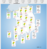 대서(大暑)이자 토요일인 23일은 전국이 대체로 흐리겠다.전북 동부와 경상 서부 내륙에는 낮에 5∼20㎜의 소나기가 내리겠다.또 저녁부터 서해안에 비가 시작돼 밤에 수도권과 충청도, 전라도 서쪽 지역으로 확대되겠다. 예상 강수량은 10∼50mm다.아침 사이 내륙을 중심