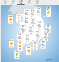 목요일인 14일은 전국이 대체로 흐린 가운데 대부분 지역에서 비가 그치면서 무더위가 다시 시작되겠다.강원 중·남부 동해안과 경북 동해안, 경남권, 제주도에는 밤까지 10∼60mm의 비가 내리겠다.경기 동부와 강원 내륙·산지, 충북 북부에는 오후에 5∼20mm의 소나기가