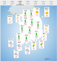 월요일인 4일은 전국에 구름이 많은 가운데 무더위가 이어지겠다.또 낮부터 저녁 사이 전국 대부분 내륙에서 천둥·번개와 돌풍을 동반한 5∼40㎜(많은 곳 60㎜ 이상)의 소나기가 내리겠다.아울러 북상하는 제4호 태풍 에어리(AERE)의 영향으로 제주도 동부·남부·산지는