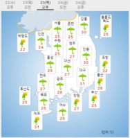 목요일인 23일은 전국이 흐리고 비가 내리겠다.비는 새벽부터 제주도에서 시작돼 오전에 전국 대부분 지역으로 확대되겠다.예상 강수량은 수도권, 강원 영서, 충청권, 경북 북부, 전라권, 서해5도 20∼80㎜, 강원 영동, 경북권 남부, 경남권, 울릉도와 독도 5∼40㎜다