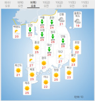 목요일인 9일은 낮(12~15시)부터 저녁(18~21시) 사이 소나기가 오는 곳이 있겠다.소나기에 의한 예상 강수량은 충청권 내륙 · 전북 동부 내륙 · 경북 북부 내륙 5~40㎜다.기상청은 "좁은 지역에서 비구름대가 발달해 내리는 소나기의 특성상 강수 정도와 강수량의