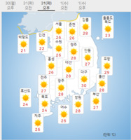 31일은 전국이 대체로 맑겠다.아침 최저기온은 9∼18도, 낮 최고기온은 22∼30도로 예보됐다.낮과 밤의 기온 차가 크겠으니 건강 관리에 유의해야 한다.바다의 물결은 동해 앞바다에서 0.5∼2.0m, 서해·남해 앞바다에서 0.5∼1.0m로 일겠다.안쪽 먼바다(해안선에
