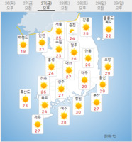 27일은 전국이 대체로 맑겠으나 중부지방은 가끔 구름이 많겠다.전국 대부분 지역에서 순간풍속이 15㎧ 안팎에 달할 정도로 바람이 강하게 불겠으니 시설물 점검과 안전사고에 각별히 유의해야 한다.경기 북동부와 강원 영서중·북부에는 가끔 비가 오는 곳이 있겠고, 돌풍과 함께