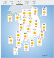 28일은 전국이 대체로 맑겠다.다만 제주도는 저녁부터 차차 구름이 많아지겠다. 아침에는 전남 해안과 전남 내륙을 중심으로 안개가 끼는 곳이 있겠다.전국 대부분 지역에서 낮과 밤의 기온 차가 15∼20도 안팎으로 매우 크겠으니 건강 관리에 유의해야 한다.동해 남부 먼바다