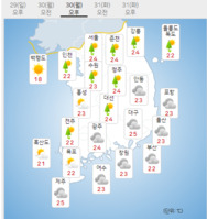 월요일인 30일은 전국이 대체로 흐리고 비가 오겠다.전날부터 남부지방을 중심으로 내리던 비는 새벽에 전국으로 확대됐다가 아침에 대부분 그치겠다.경기 동부와 강원도에서는 저녁까지 비가 이어지겠고, 서울과 충청내륙·전북내륙·경북내륙은 오전부터 오후 사이 한때 비가 오는 곳