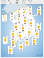 목요일인 19일은 전국에 가끔 구름이 많겠다.이날 전국은 제주도남쪽해상에서 동진하는 고기압의 가장자리에 들겠다.기상청은 "내륙을 중심으로 낮과 밤의 기온 차가 15~20도로 매우 크겠으니 건강관리에 각별히 유의해야 한다"고 전했다.이어 "서해중부해상에 바다 안개가 짙게