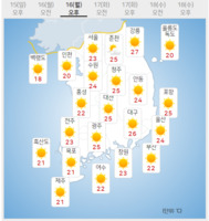 월요일인 16일은 전국이 대체로 맑겠다.이날 전국은 중국 상하이 부근에서 동쪽으로 이동하는 고기압의 영향을 받겠다.기상청은 "낮부터 따뜻한 남서풍이 불면서 기온이 차차 올라 당분간 내륙을 중심으로 일교차가 15∼20도로 크겠으니 건강 관리에 유의해야 한다"고 당부했다.