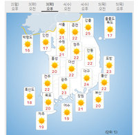 화요일인 3일은 전국이 맑겠다.아침 최저기온은 3∼10도, 낮 최고기온은 17∼25도로 예보됐다.대기 확산이 원활해 미세먼지 농도는 전 권역이 '좋음'∼'보통' 수준을 보이겠다.기상청은 "내륙을 중심으로 서리가 내리는 곳이 있겠으니 냉해 피해가 없도록 유의해야 한다"고