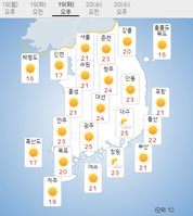 화요일인 19일은 전국이 대체로 맑겠으나 남부지방은 오후에 가끔 구름이 많겠다.이날 전국은 산둥반도에서 동쪽으로 이동하는 고기압의 영향을 받겠다.기상청은 "건조특보가 발효된 서울 및 일부 수도권과 충청 내륙·강원·전라 동부·경상권은 날씨가 매우 건조하겠으니 산불 등 각