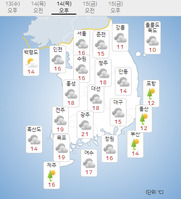 목요일인 14일은 전국이 대체로 흐리고 서울과 경기 북부, 강원 영서 북부를 제외한 전국 대부분 지역에 비가 내리겠다.이날 전국은 기압골의 영향을 받다가 낮부터 차차 벗어나겠다.기상청은 "전날부터 예상되는 강수량은 제주도 20∼60㎜, 충청권·전북·전남 북부·경북권 5