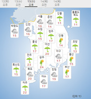 수요일인 13일은 전국이 대체로 흐리고 비가 내리겠다.이날 전국은 기압골의 영향을 받겠다.기상청은 "서울·인천·경기 북부와 강원 북부 등 중부지방에는 새벽에 비가 오는 곳이 있겠다"면서 "경기 남부와 강원 남부, 충청권에도 가끔 비가 오겠다"고 전했다.이어 기상청은 "