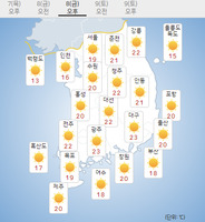 금요일인 8일은 전국이 대체로 맑겠다.이날 전국은 서해상에서 동쪽으로 이동하는 고기압의 영향을 받겠다.기상청은 "강원 산지에는 저녁부터 바람이 매우 강하게 불겠으니 시설물 관리와 안전사고에 유의해야 한다"고 전했다.그러면서 기상청은 "서해상과 제주도 해상에는 안개가 짙
