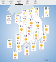 수요일인 6일은 중부지방에 가끔 구름이 많은 가운데 낮과 밤의 기온 차가 크겠다.이날 전국은 남해상에 위치한 고기압의 가장자리에 들겠다.기상청은 "내륙을 중심으로 낮과 밤의 기온 차가 15∼20도로 매우 크겠으니, 건강관리에 유의해야 한다"고 전했다.그러면서 기상청은