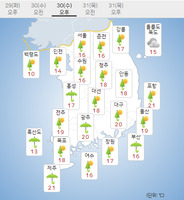 수요일인 30일은 전국이 아침부터 차차 흐려져 비가 내리겠다. 비는 아침에 제주도부터 시작돼 오후에 그 밖의 전국으로 확대되겠다.이날 전국은 본 동쪽 해상에 위치한 고기압의 가장자리에 들다가 차차 서쪽에서 다가오는 기압골의 영향을 받겠다.기상청은 "예상 강수량은 31일