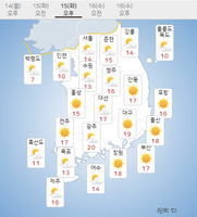 화요일인 15일은 전국에 가끔 구름이 많은 가운데 일교차 큰 날씨가 이어지겠다.이날 전국은 서해남부해상에서 동진하는 고기압의 가장자리에 들겠다.기상청은 "서해안에 인접한 일부 교량(서해대교, 영종대교, 인천대교 등)과 도로, 항만 인근에 안개가 짙게 낄 수 있으니 교통