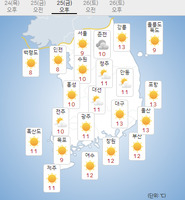 금요일인 25일은 전국에 가끔 구름이 많은 가운데 추위가 한풀 꺾이며 평년 기온을 회복하겠다.이날 전국은 중국 상하이 부근에서 동진하는 고기압의 가장자리에 들겠다..기상청은 "기온은 전날 낮부터 차차 올라 이날부터 평년 기온(최저기온 -6∼3도, 최고기온 6
