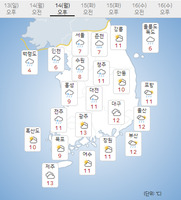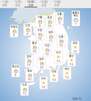 토요일인 12일은 전국에 구름이 많고 낮에는 대체로 맑겠다.이날 전국은 중국 북부지방에 위치한 고기압의 가장자리에 들겠다.기상청은 "전국 대부분 지역에서 아침 최저기온은 0도 내외, 낮 최고기온은 10도 내외의 분포를 보이며 평년보다 기온이 높겠다"고 전했다.그러면서