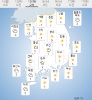 정월대보름이자 화요일인 15일은 전국이 대체로 흐리다 낮부터 차차 맑아지겠다.이날 전국은 중국 북부지방에서 확장하는 찬 대륙고기압의 영향을 받겠다.기상청은 "강원 내륙·산지와 충청권, 전북, 전남 북부, 경상 서부 내륙, 제주도는 새벽까지 비 또는 눈이 오겠다"고 전했