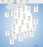 금요일인 11일은 전국에 가끔 구름이 많겠다.이날 전국은 서해상에 위치한 고기압의 가장자리에 들겠다.기상청은 "12일 밤(21~24시)부터 제주도산지에는 눈이 오는 곳이 있겠다"고 전했다.그러면서 기상청은 "오늘과 모레 눈이 내리는 제주도산지를 중심으로 가시거리가 짧고