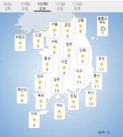목요일인 10일은 전국에 구름이 많다가 오전부터 차차 맑아지겠다.이날 전국은 서해상에 위치한 고기압의 가장자리에 들겠다.기상청은 "건조특보가 발효 중인 서울과 일부 경기내륙, 강원영동, 일부 충북, 전남동부, 경상권을 중심으로 대기가 매우 건조하겠고, 그 밖의 지역도